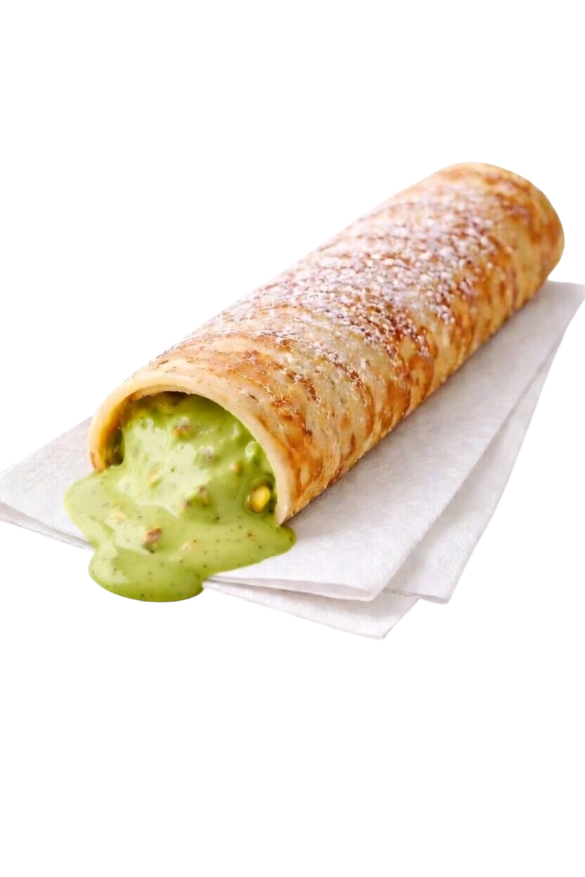 Mekana, svježe pečena palačinka punjena bogatim namazom od pistacija. Kremasta tekstura od pistacija stvara savršenu kombinaciju za pravi slatki užitak.