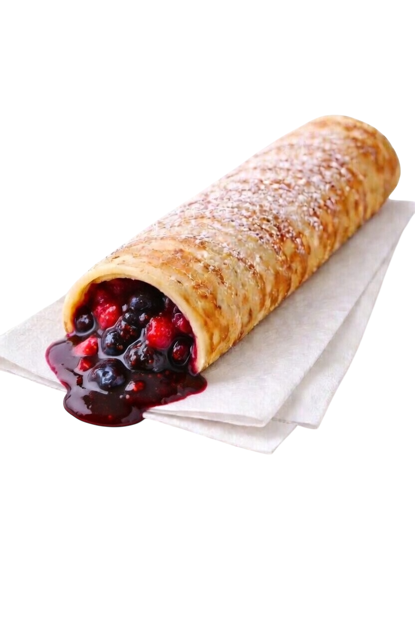 Mekana, svježe pečena palačinka punjena bogatim preljevom od šumskog voća. Savršena kombinacija slatkih i kiselkastih voćnih okiusa.