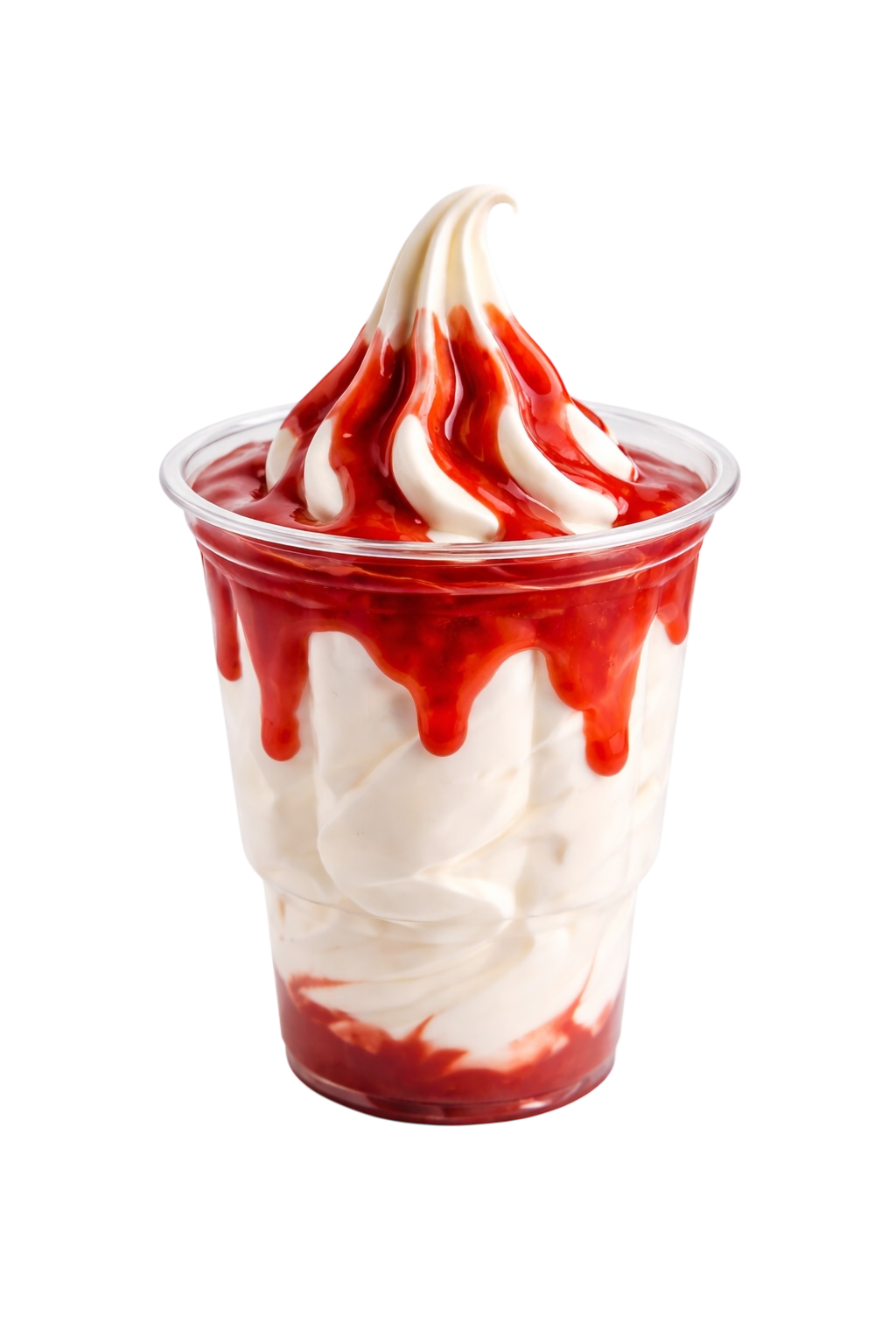 Kremasti sladoled preliven slatkim preljevom od jagode koji donosi svjež, voćni okus u svakom zalogaju.